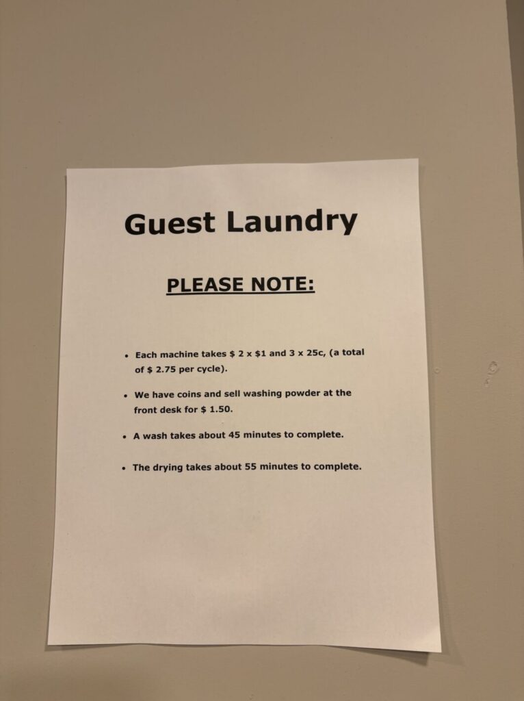 洗濯も乾燥も、それぞれ2.75ドル。1ドル硬貨2枚、25セント硬貨3枚が必要なので、フロントで洗濯と乾燥がしたい旨を伝えて両替をしてもらいます。