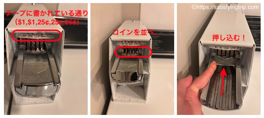 テープに書かれている通り($1,$1,25¢,25¢,25¢)コインを並べて、ぐっと押し込む!です。こんなの、初見でわかるわけなーい!